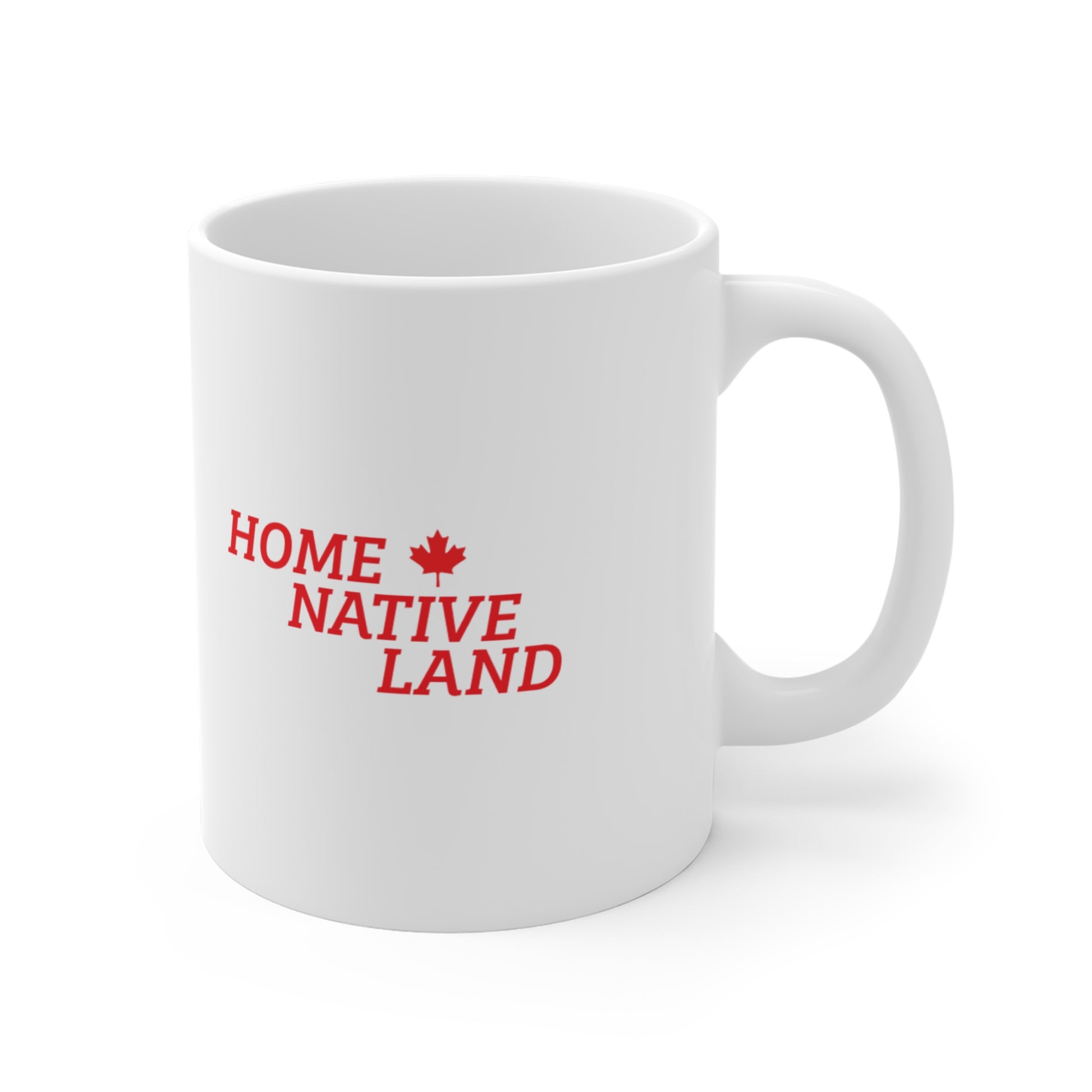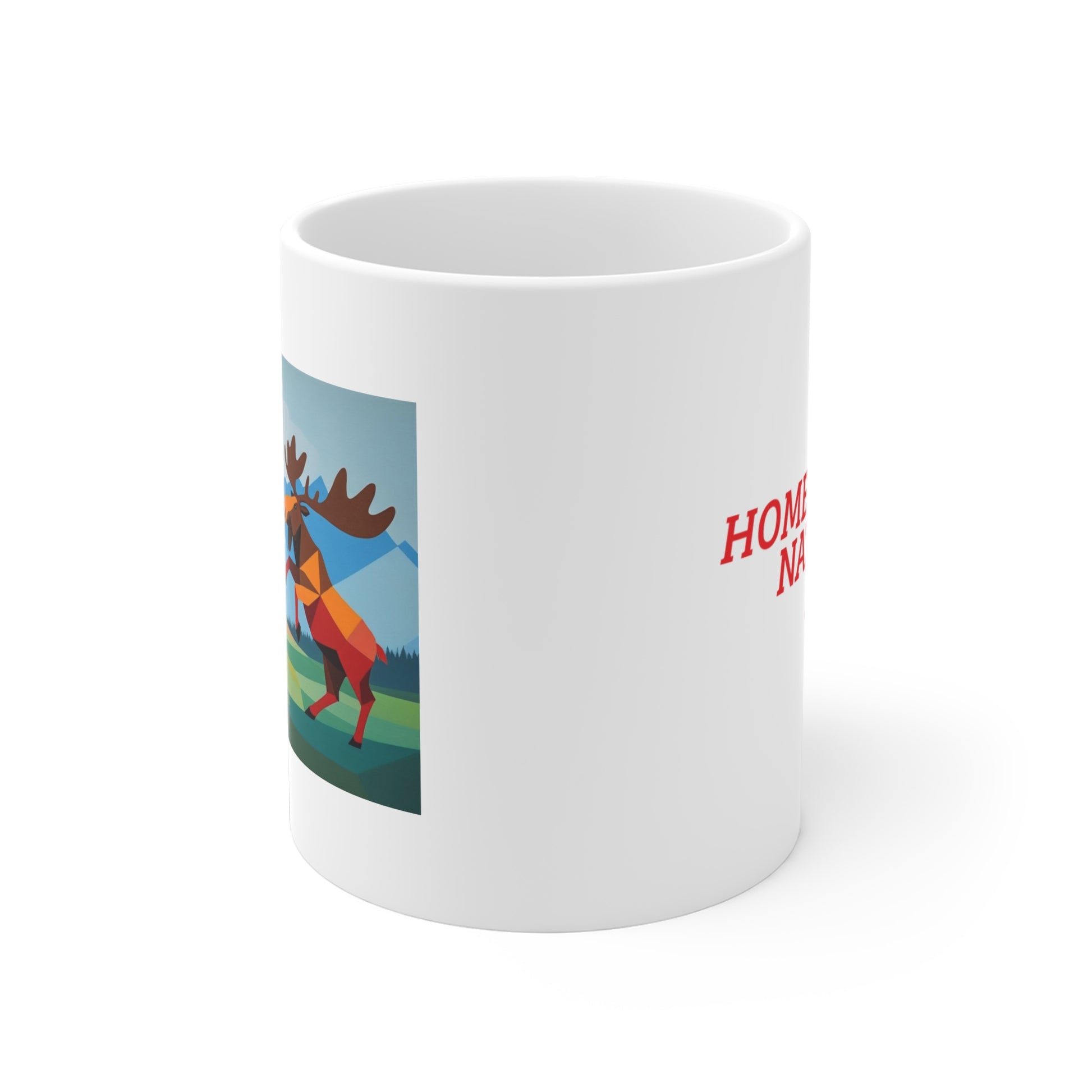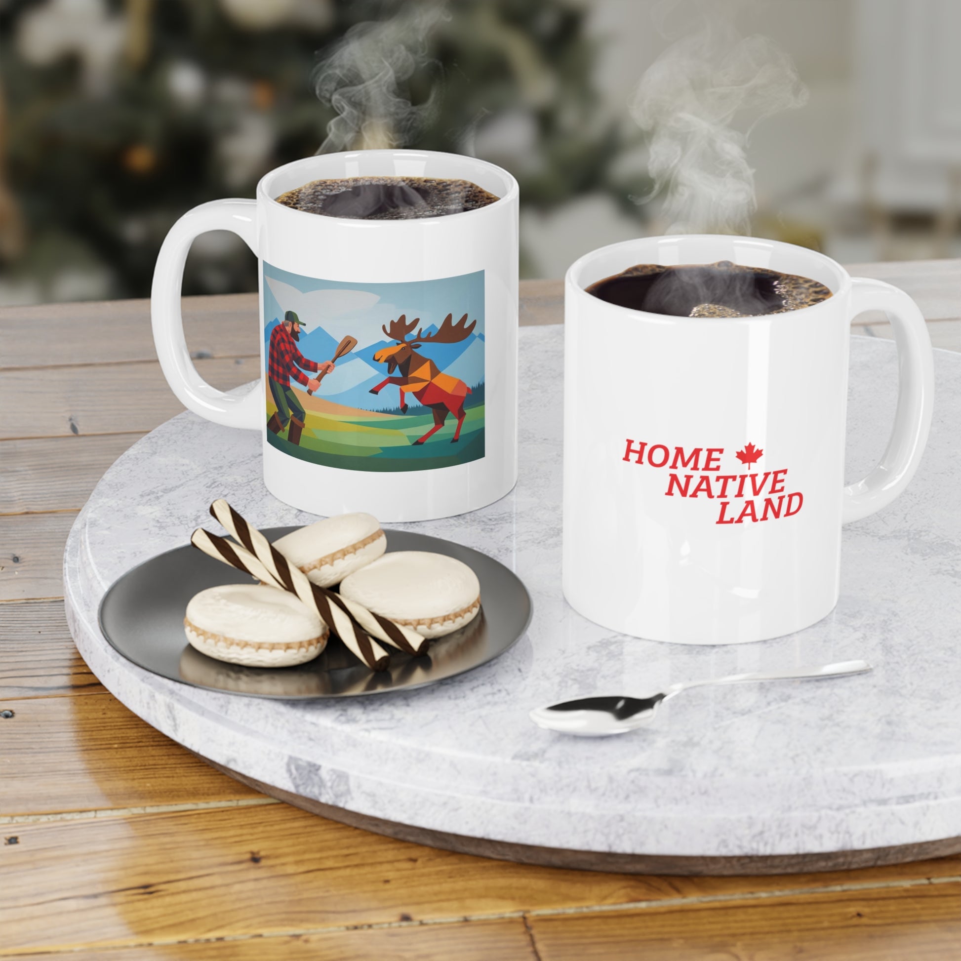 Bring some personality to your morning routine with this 11oz ceramic mug, featuring a unique design that stands out. One side showcases our Home and Native Land logo, while the other features an eye-catching illustration—like a plaid-clad lumberjack and a moose “sharing a moment” in the great outdoors.