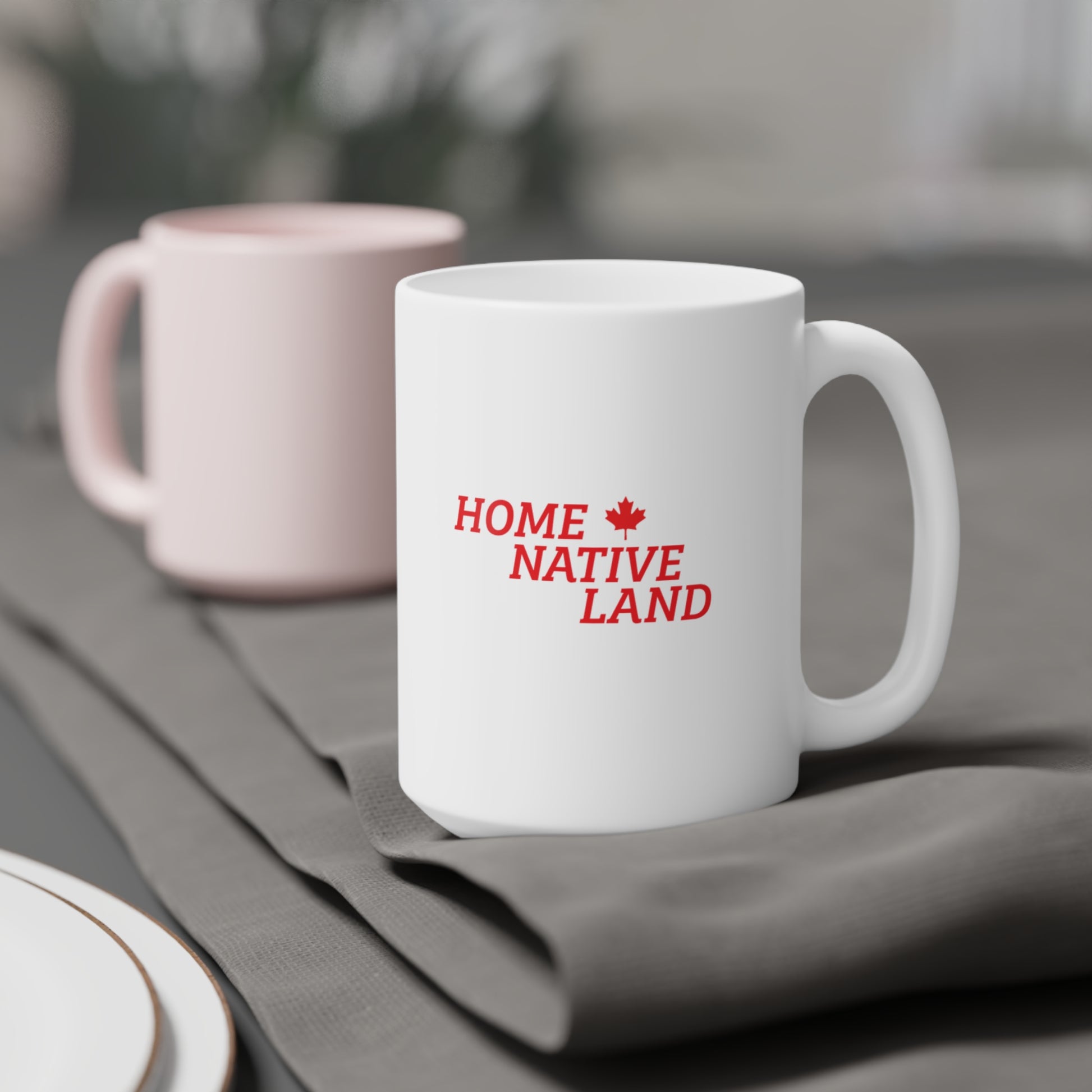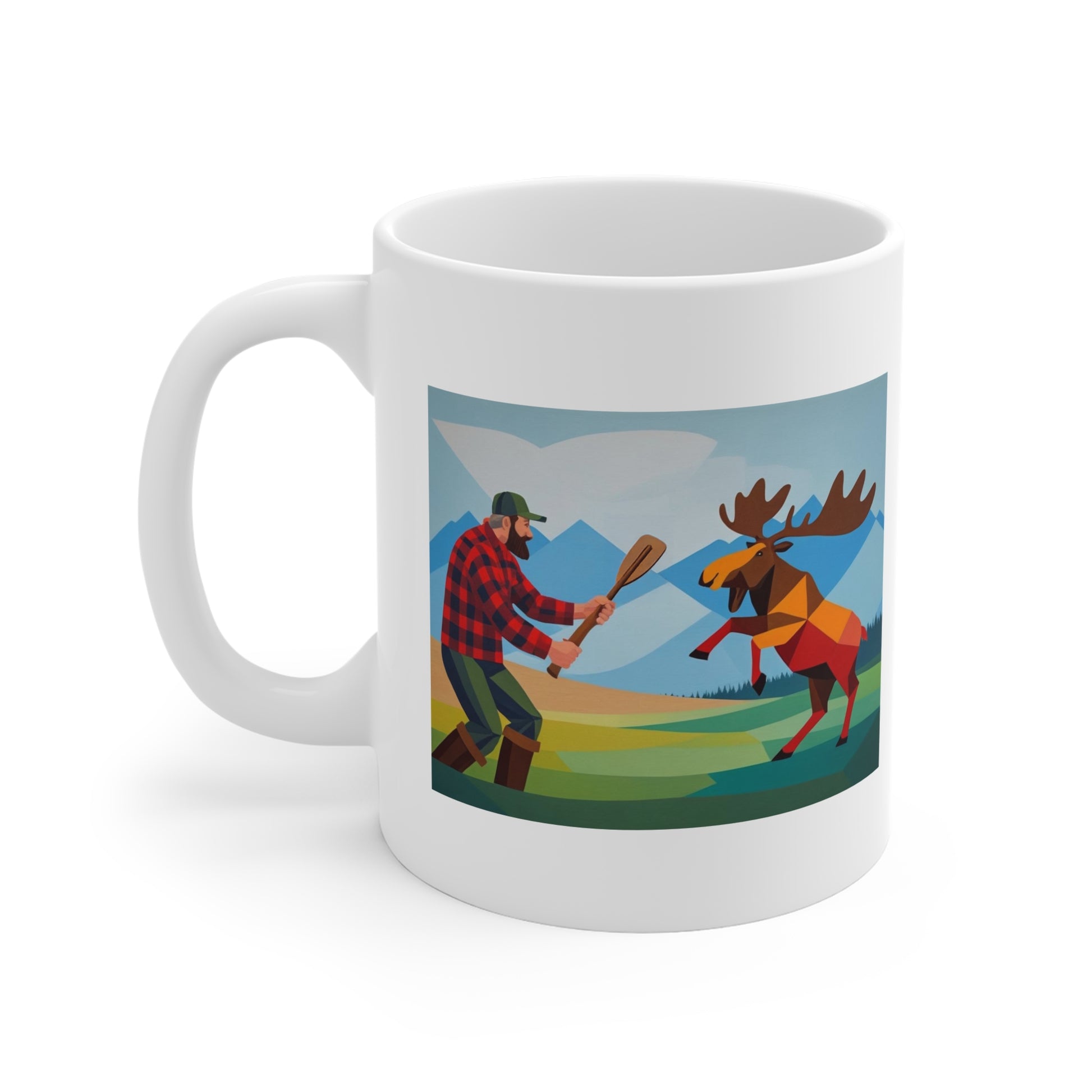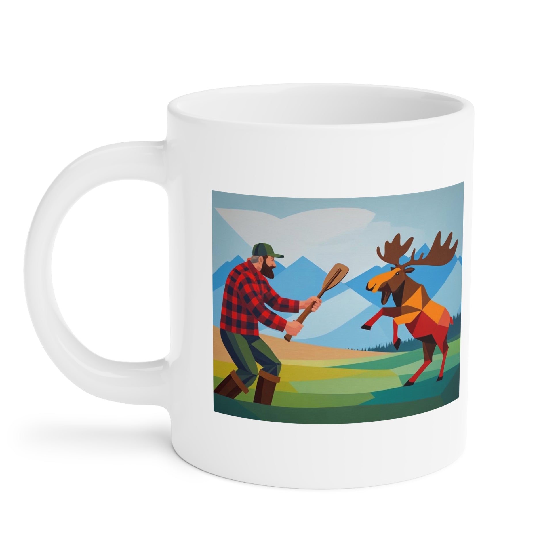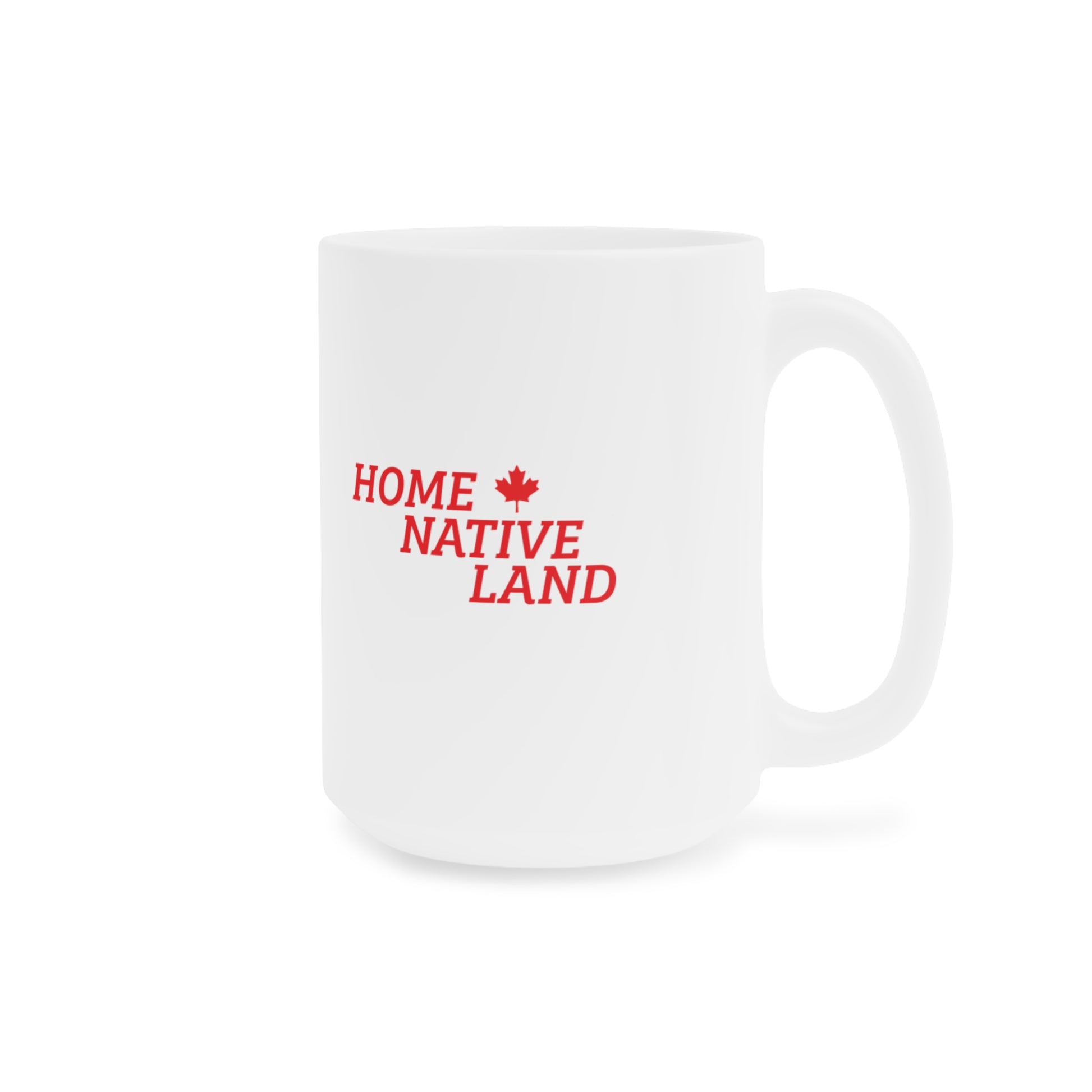 Bring some personality to your morning routine with this 11oz ceramic mug, featuring a unique design that stands out. One side showcases our Home and Native Land logo, while the other features an eye-catching illustration—like a plaid-clad lumberjack and a moose “sharing a moment” in the great outdoors.